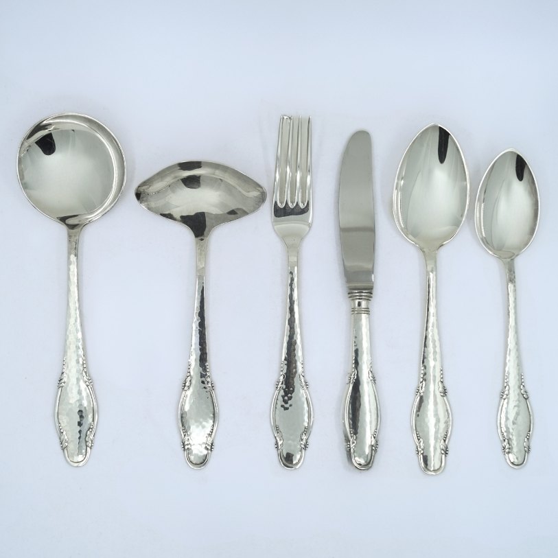 Bestik af tretårnet sølv til 12 personer. I alt 74 dele,