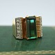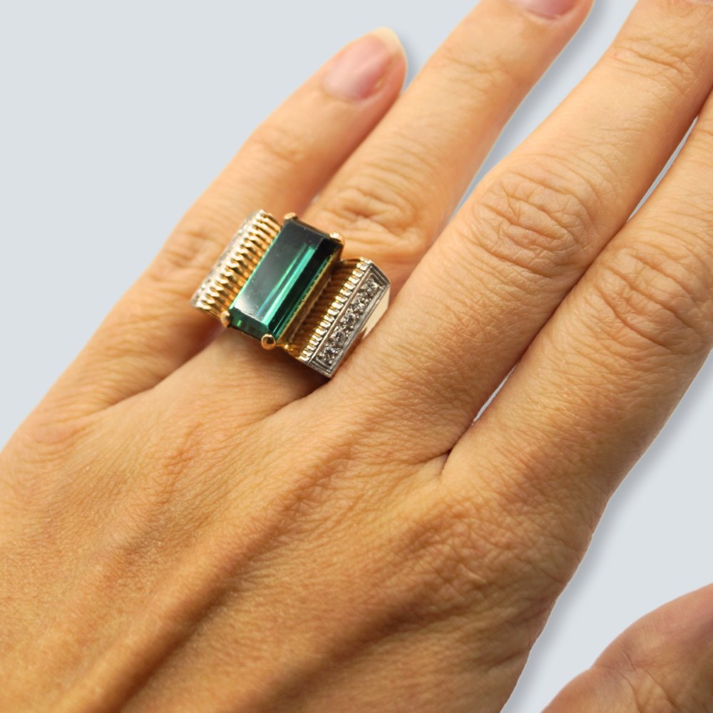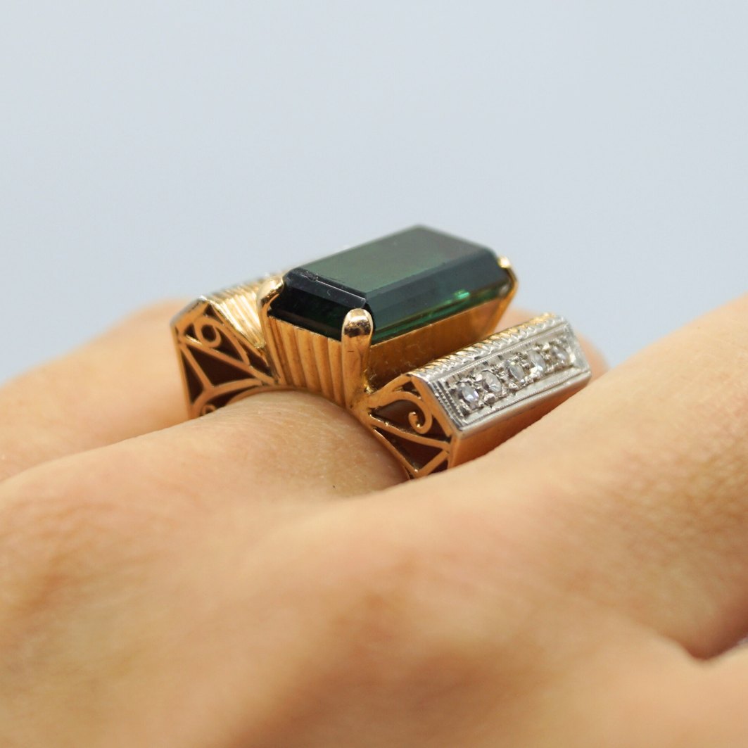 Guldring med en stor facetslebet grøn turmalin og 10 små diamanter, i alt ca. 0,20 ct. Wesselton - VVS. Diamanterne er fattet i hvidguld. Ringstørrelse ca. 49.