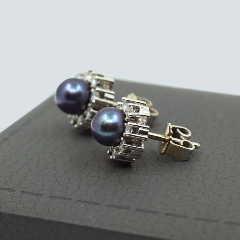 C. Antonsen; Par øreringe i 18 kt. hvidguld, med perle og diamanter, i alt ca. 0.48 ct. TW VS. Ørestikker diameter ca. 9,5 mm.
