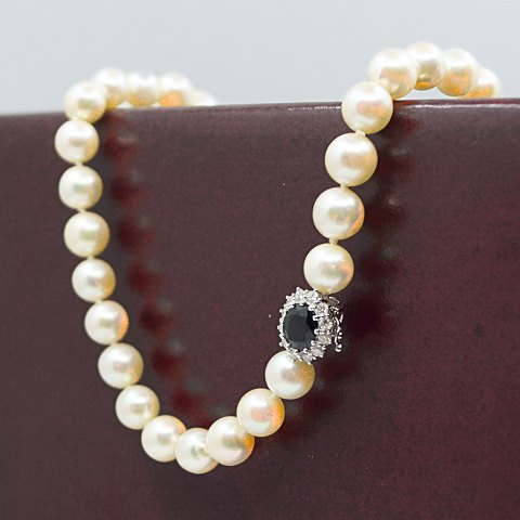 Hartmann's; Perlekæde prydet med safir- og diamantlås, 18 kt. hvidguld