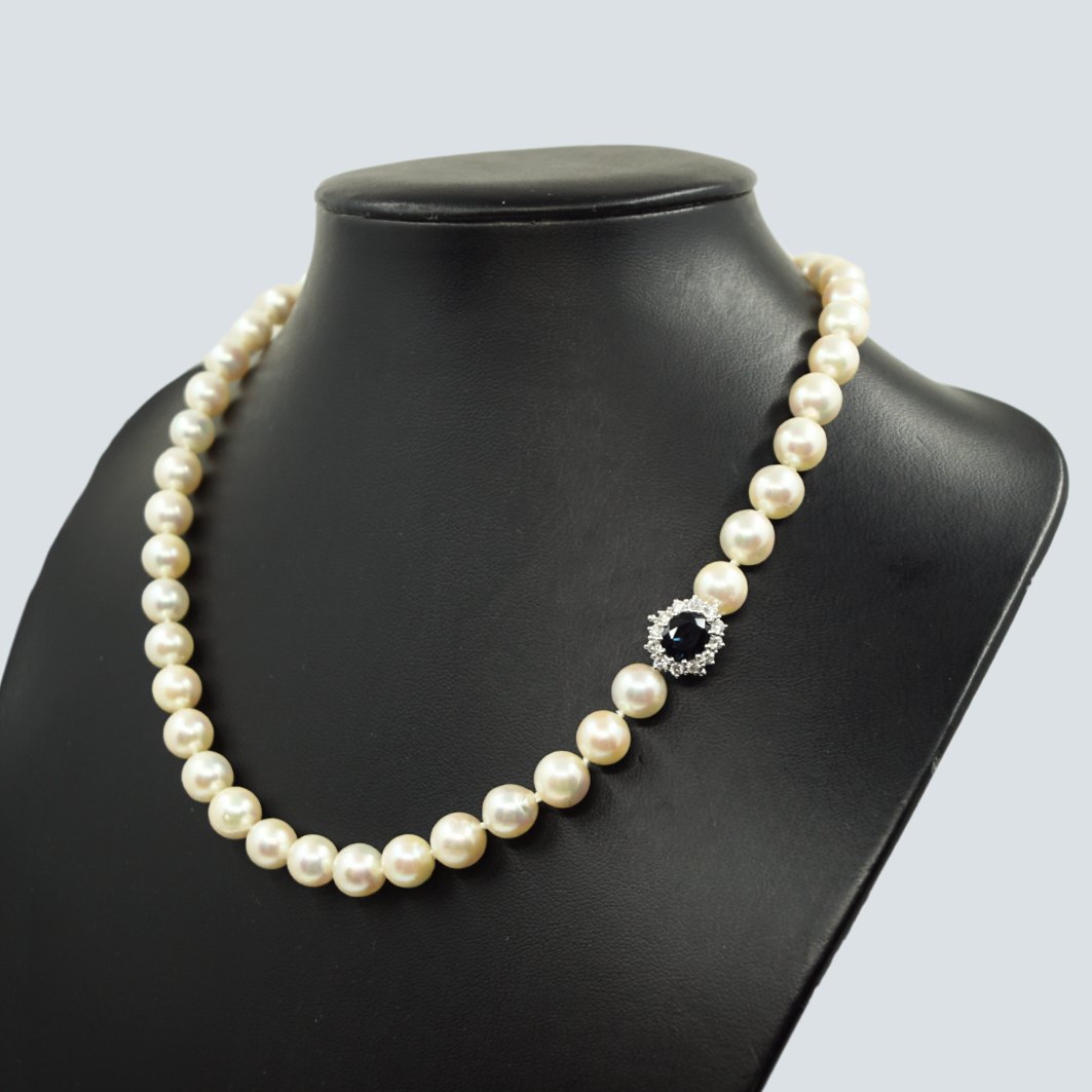Hartmann's; Perlekæde med safir- og diamantlås i 18 kt. hvidguld. Kulturperler med knuder mellem mellem hver enkelt perle. Diam. ca. 9 mm. Smykkelås af 18 kt. hvidguld prydet med safir, 1,86 ct., omkranset af diamanter, i alt 0,36 ct. Top Wesselton VVS - VS.