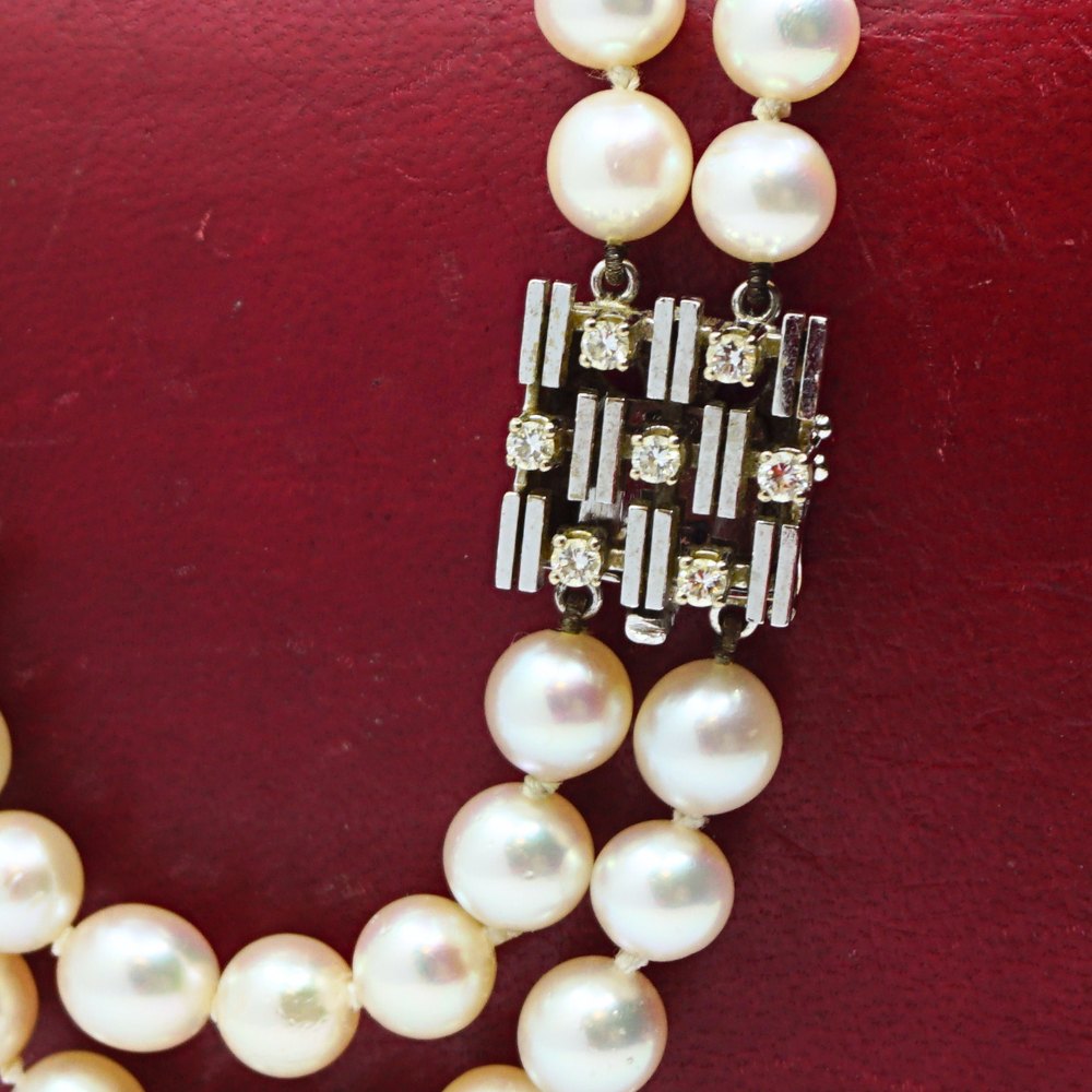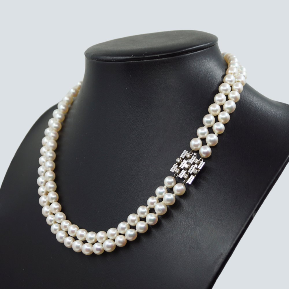 Hugo Grün; A pearl necklace with 14k white gold clasp, set with diamonds