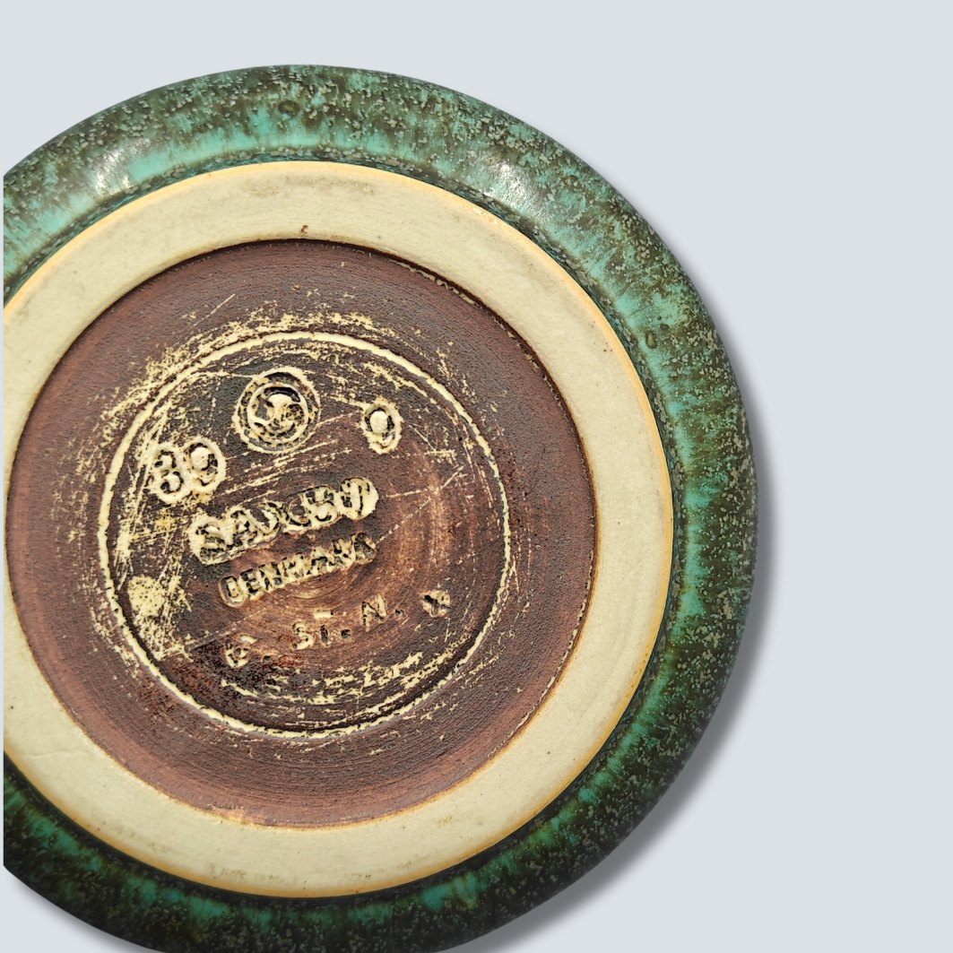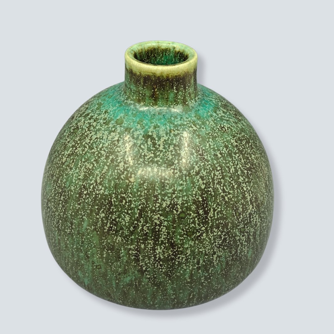 A stoneware vase decorated in a green glaze #39. H. 9,3 cm. Diameter app. 9 cm. Stamped