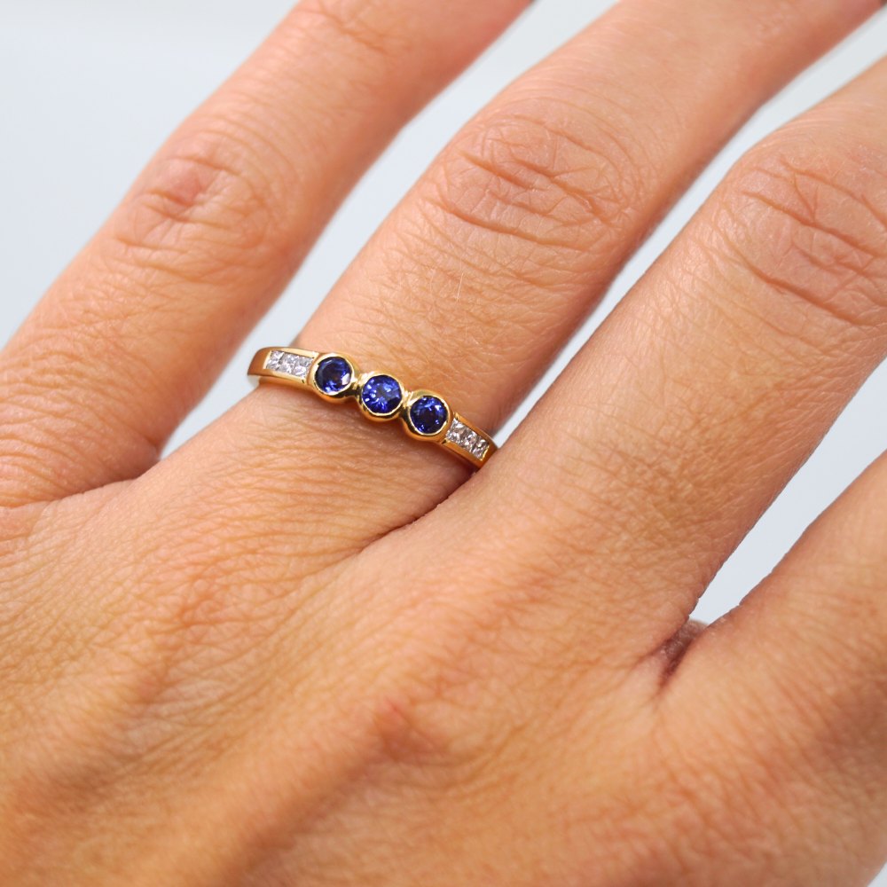 Ring i 18 kt. guld, prydet med tre safirer og seks diamanter, i alt 0.12 ct. Ring str. 50-51. Stemplet "750". Kontakt os gerne, hvis du søger noget specifikt. Hvad du ser på vores hjemmeside, er blot et udvalg af det, som vi har.