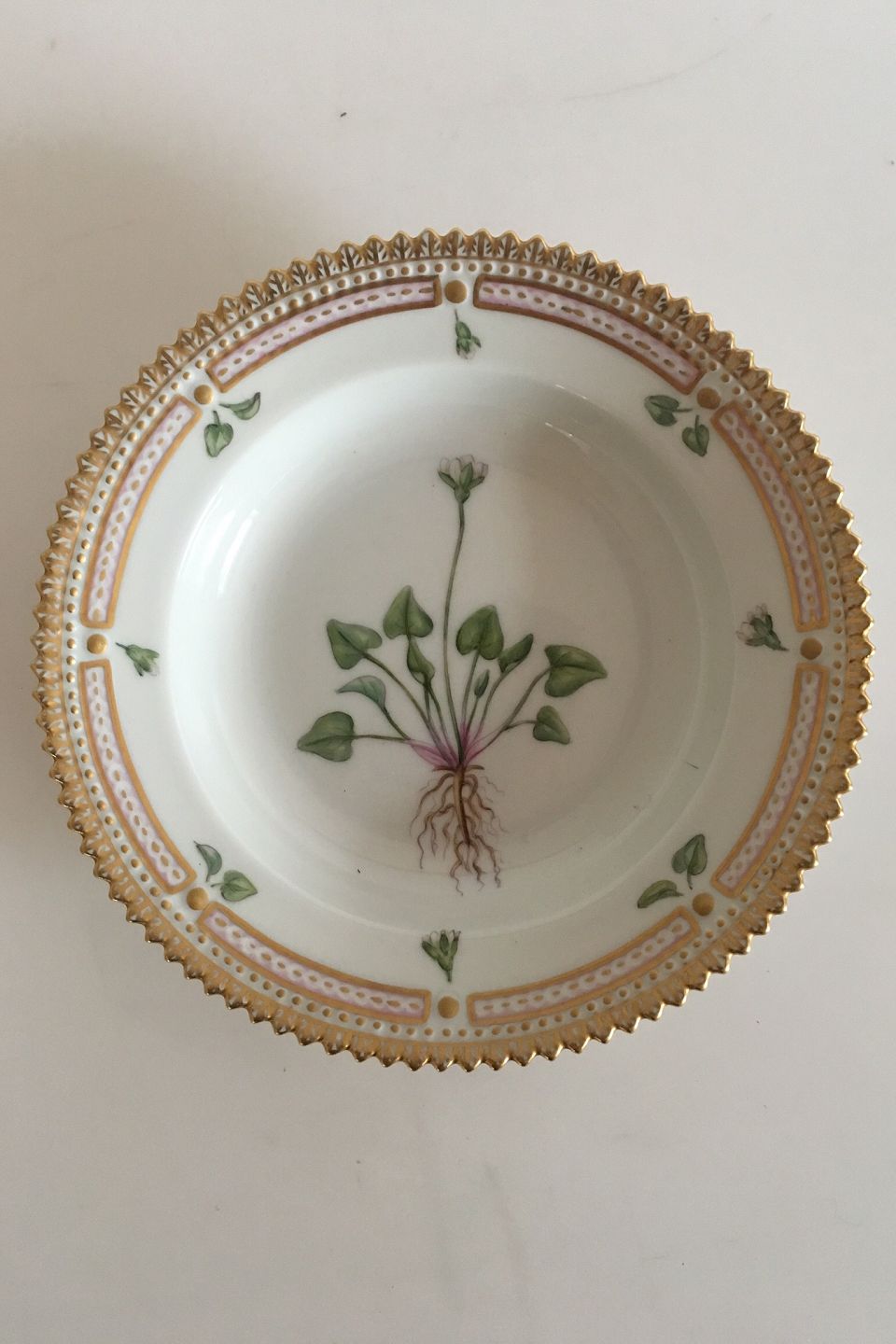 Kongelig Porcelæn Flora Danica Frugt tallerken 20/3590 nyt nummer 601. Blomsten er: Parnassia Kotzebuei Cham & Schldl. Måler 14,5cm, første sortering og i perfekt stand.