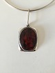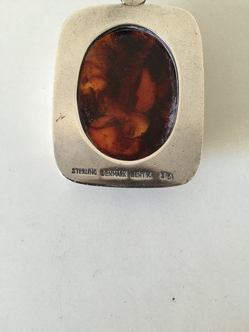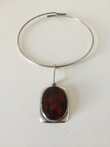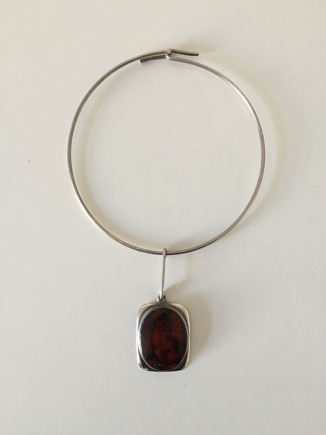 Bent Knudsen Necklace in sterling silver and amber. Marked Sterling, Denmark, Bent K, 35. Measures 12.5 cm / 4 59/64" in dia and the pendent 4.5 cm / 1 49/64". I really good shape. The amber piece do have some wear. Weighs 43 g / 1.55 oz