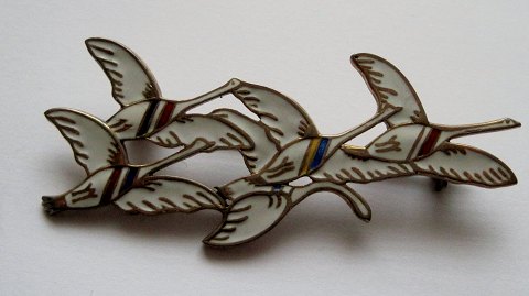 Erik Magnussen Sølv broche med emalje af de 5 svaner. Broche med 5 svaner symboliserende de nordiske lande, 1940. I perfekt stand og måler 6cm.