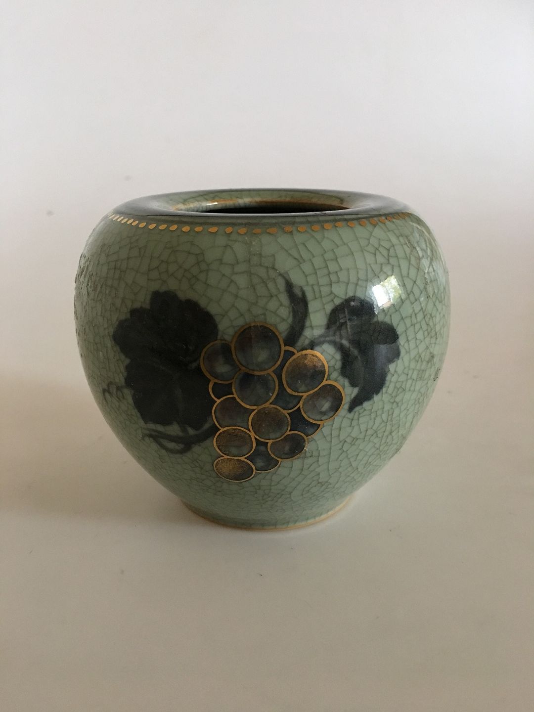 Royal Copenhagen Krakele Vase i Grøn og Guld med vindruer. Mærked med 3 bølger, 5060/2237 og efx. Måler 9cm høj og i perfekt stand.