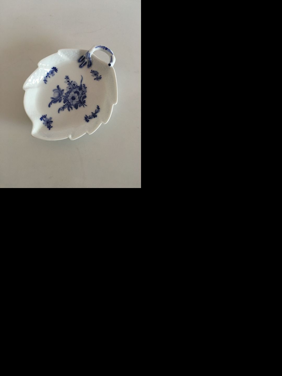 Royal Copenhagen Blå Blomst Flettet Bladformet skål No 8001. Måler 18cm og er i god stand.