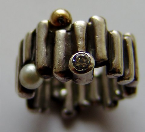 Hans Henrik Nygaard Unika sterling sølv ring med perle, sten og guldperle. God stand. Ring størrelse 53.