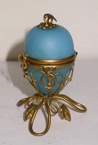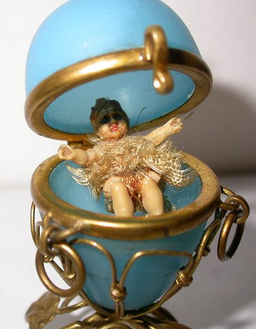 Opal glas i form af æg i stativ med overraskelse. Lille dukke isat. Glasæg i stativ formodenligt fransk og fra omkring 1900. 7 cm høj.