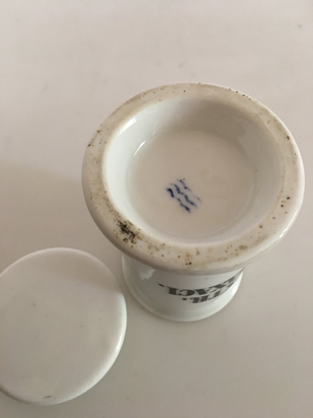 Royal Copenhagen Apotekerkrukke med låg fra 1880. Sjældent set i denne størrelse. Måler 8 cm høj og er i perfekt stand.