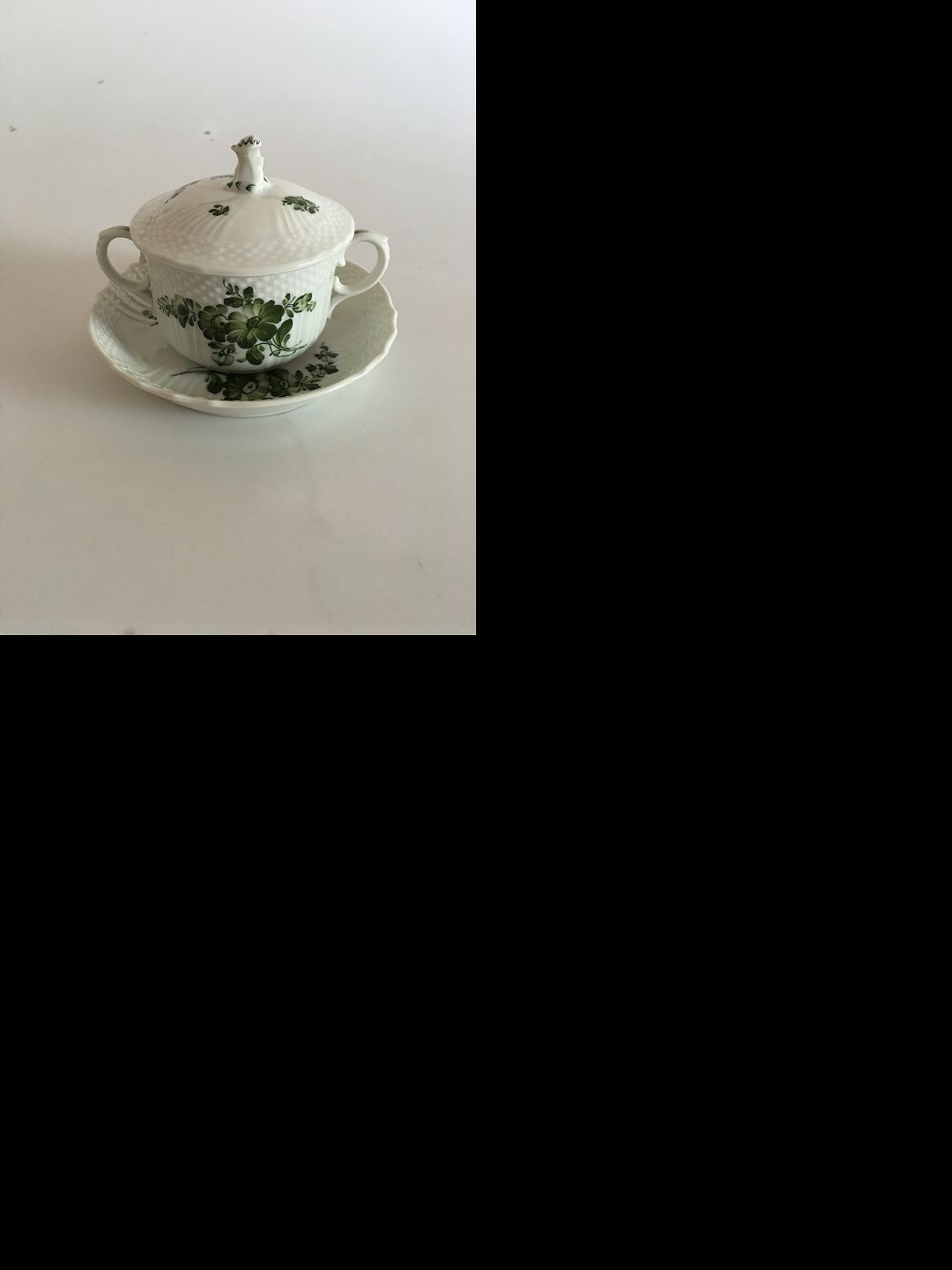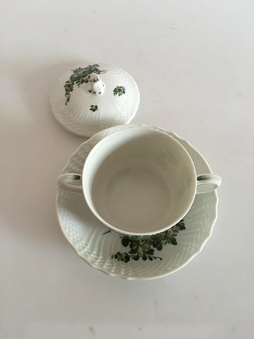 Royal Copenhagen Green Flower curved Bouillon Cup, lid and saucer No 110/1552. Cup measures 12,5cm and 9cm high. Saucer measures 13,6cm