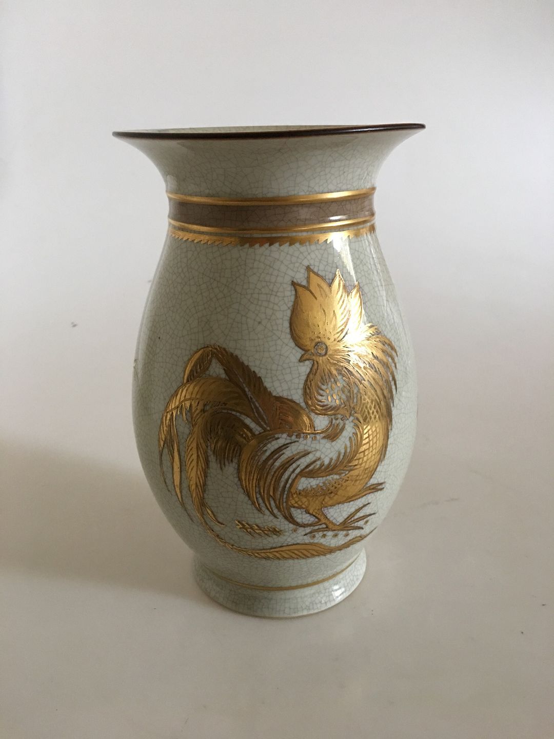 Royal Copenhagen crackle Vase med Guld No 146/2490. Measures 21cm and is in good condition. Motif is a rooster.