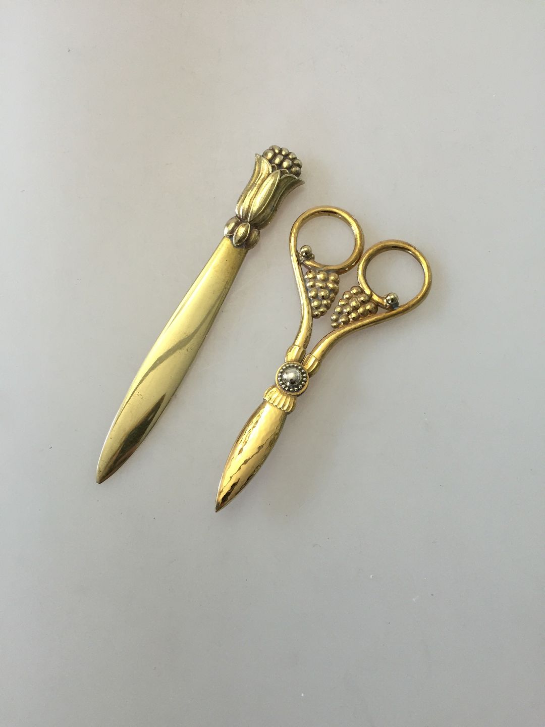 "Georg Jensen" Druesaks og Brevkniv udført i kobber af ansat hos Georg Jensen. Saks måler 13,4cm og kniv 15,6cm.