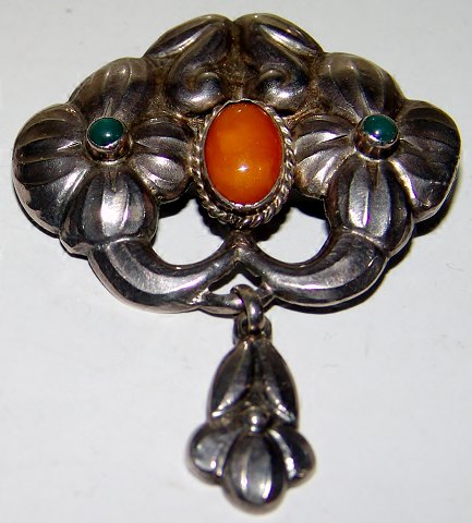 Dansk Skønvirke Broche med Rav og Grønne Sten. Måler 6,2cm x 5,1cm og er i god stand.