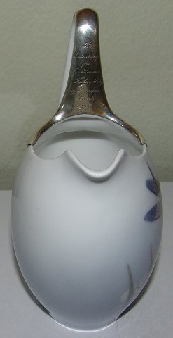 Royal Copenhagen Art Nouveau Mælkekande med guldsmed No 16/4. Med sølvmontering der har indskription. Måler 17,2cm og er i perfekt stand.
