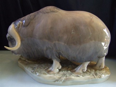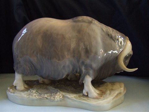 Royal Copenhagen Figur Muskus Okse No 530. Måler 18cm x 29cm og er i good stand, men oksens horn har reparation. Designet af Erik Nielsen.