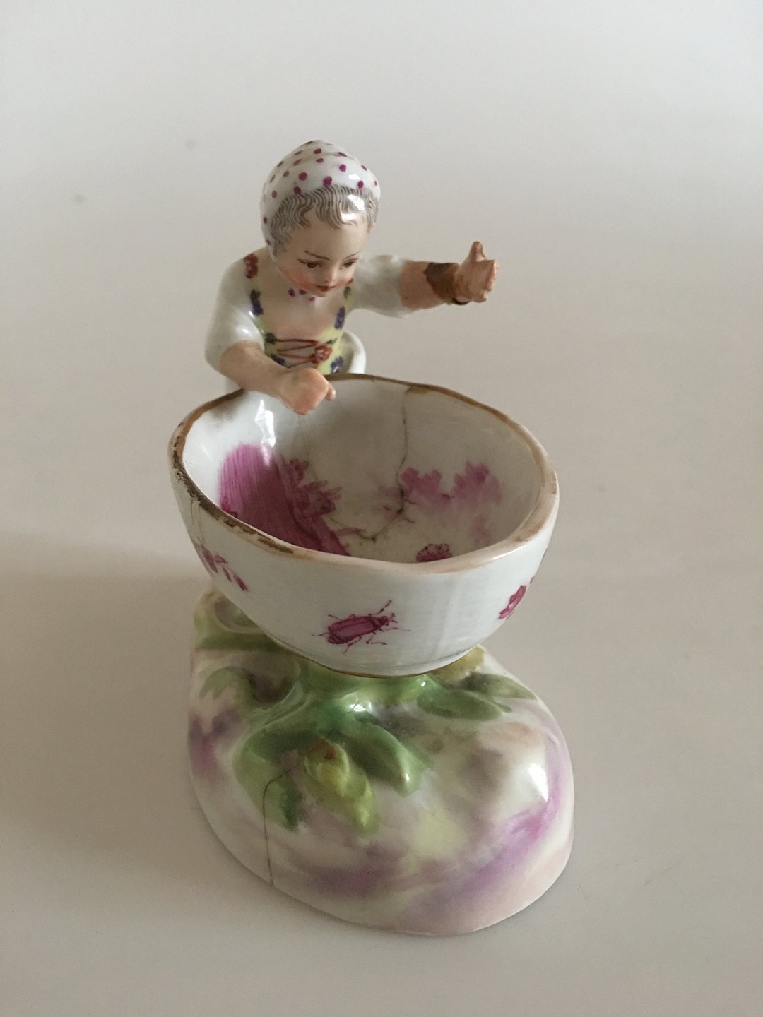 Tidlig Meissen Saltskål. Pige figur og landskabsmaleri i bowle. Måler 10,5cm x 12cm. Har div. mangler, reparationer.