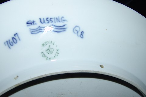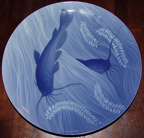 Royal Copenhagen Unika Vægtallerken af Stephan Ussing fra 1900 No 7607 med karper. Måler 29,5cm. Har en brændingsrevne lige ved signaturen på forsiden og en kant skrap kl.23. Fantastisk unika arbejde, sjældent set så godt.