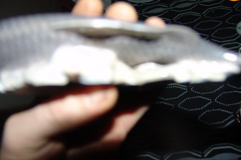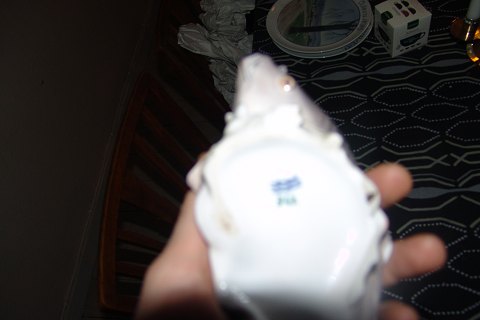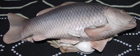 Royal Copenhagen Art Nouveau Carp fish on seaweed and clams No 562. Measures 22,5cm and has damage.