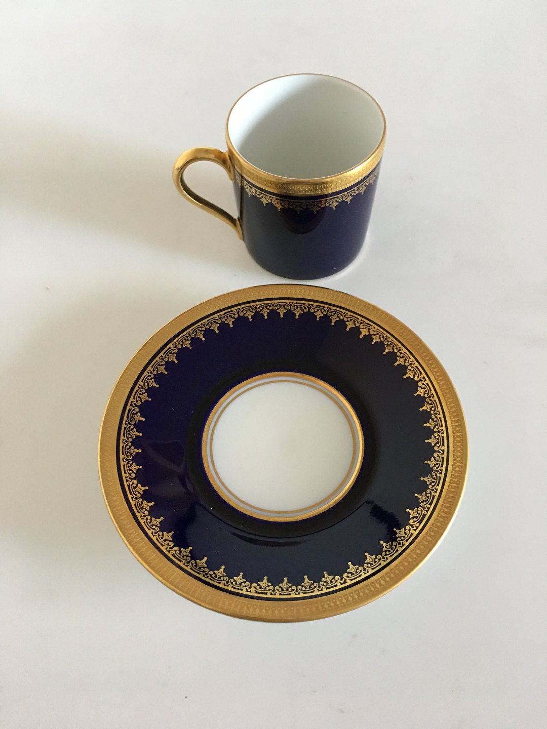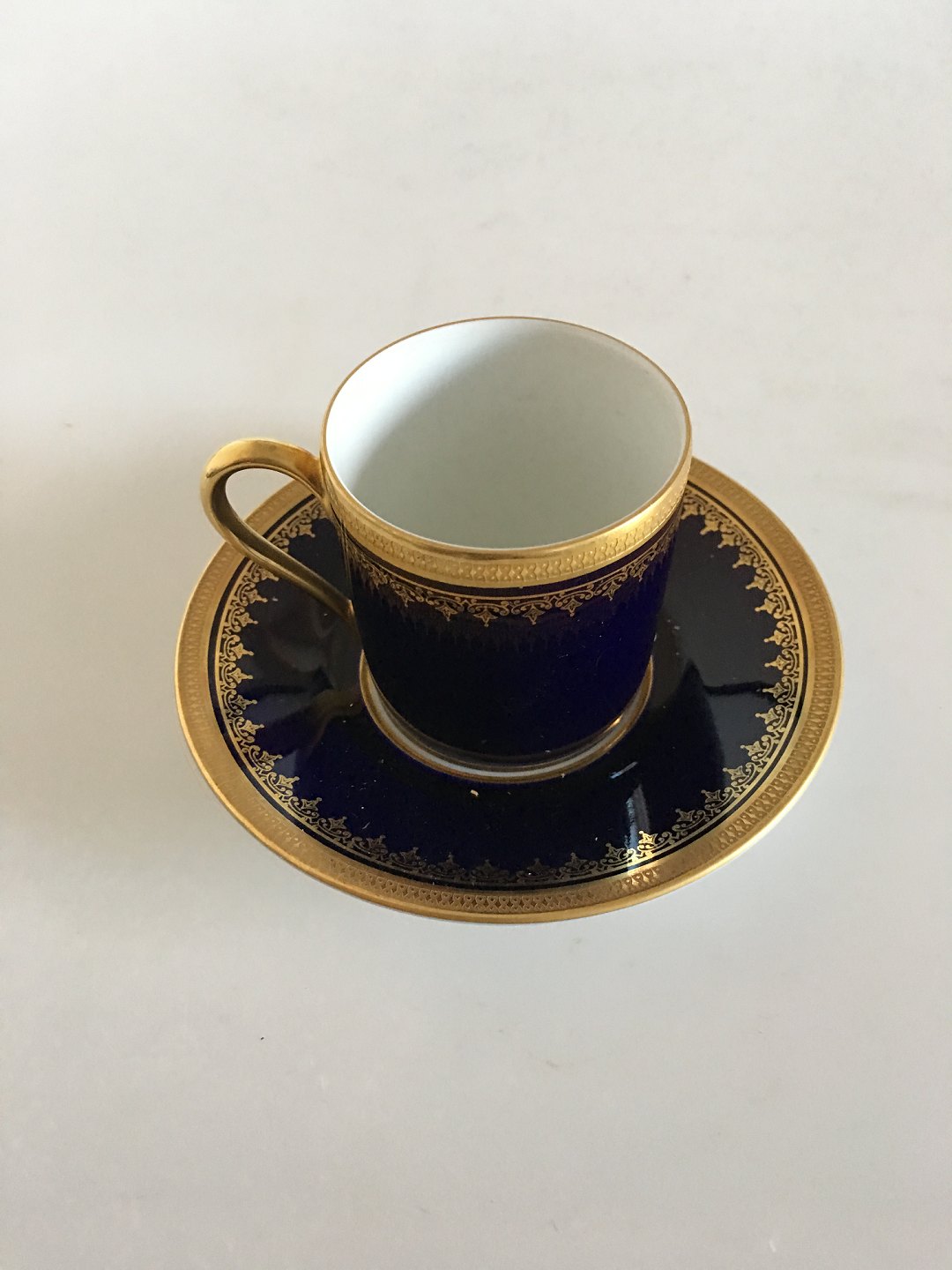 Rosenthal Mokka Kop i guld og blå. Måler 5 cm høj og 5 cm dia. Lettere slid på guldet.