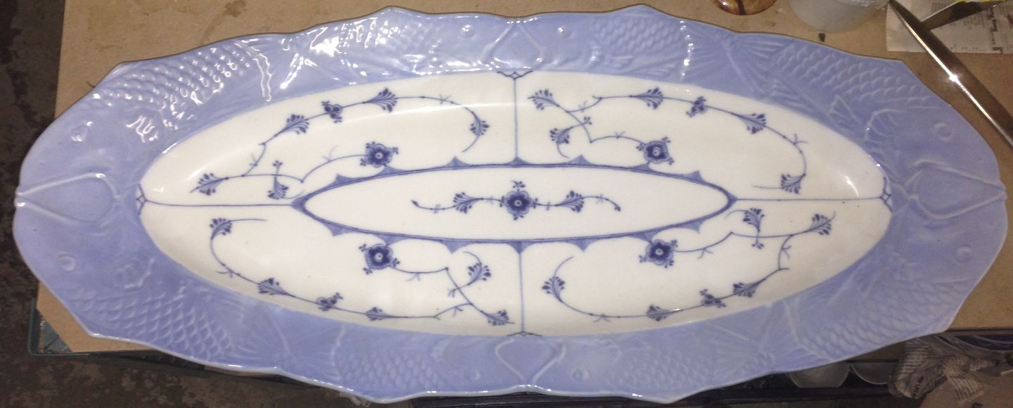 Royal Copenhagen Blue Fluted Plain Fish platter with fish border. Measures 61cm x 25cm and is in good condition.