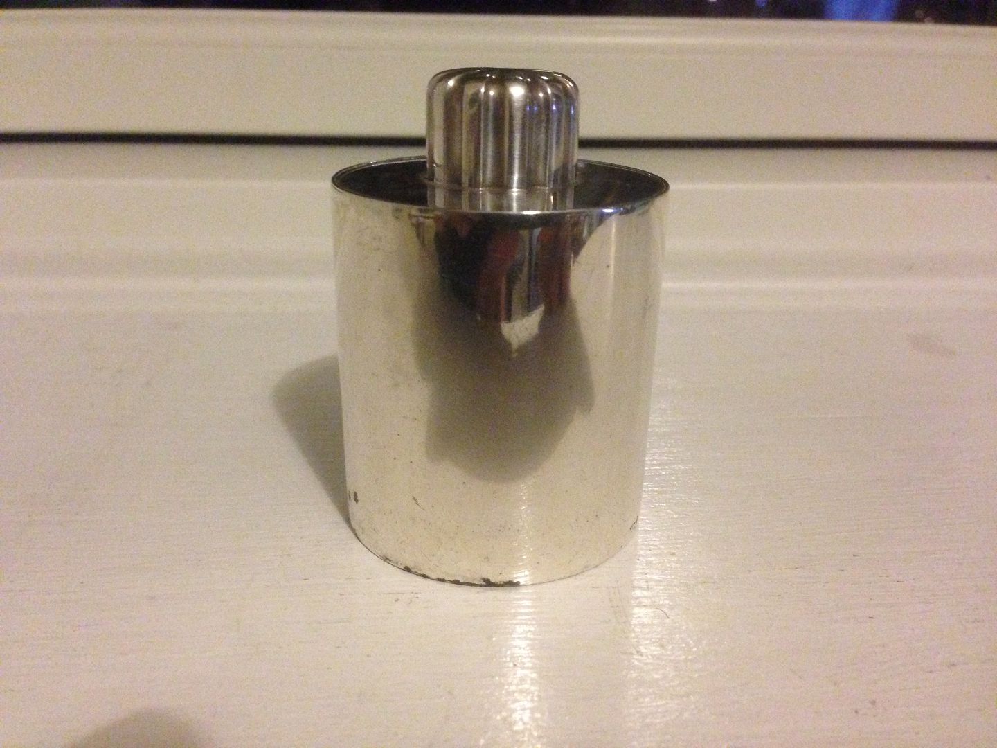 Georg Jensen Sigvard Bernadotte Mustard Pot with Spoon No 834. Measures 7cm high and is in good condition. Enamel as a tiny chip.