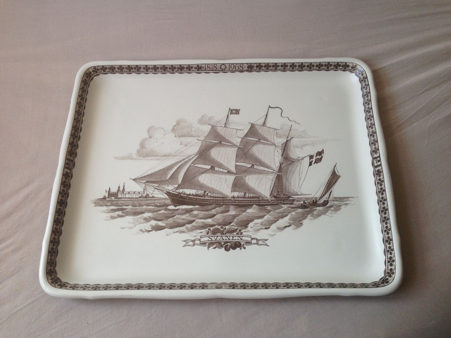 Royal Copenhagen Aluminia The bakkebord med skib "svanen". Måler 67cm x 53cm og er i perfekt stand.