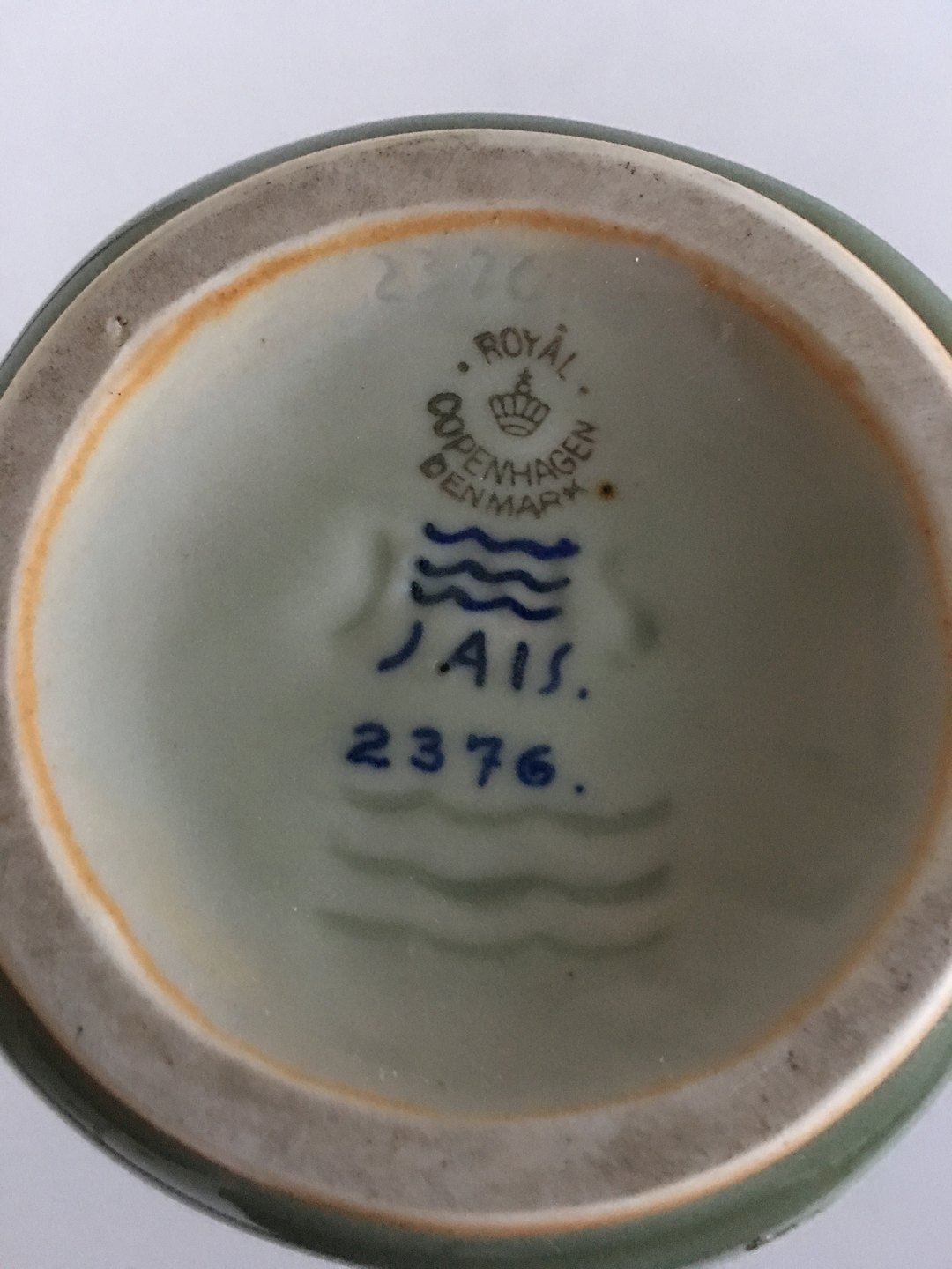 Royal Copenhagen Jais Nielsen Stoneware Vase in Celedon Glaze No 2376. Measures 20,6cm and has a few factory figurine issues.