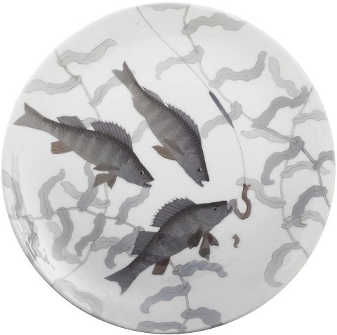 Royal Copenhagen Art Nouveau Unika Vægtallerken med Aborre fra 1900 No 6790. Måler 30,5cm og er i perfekt stand.