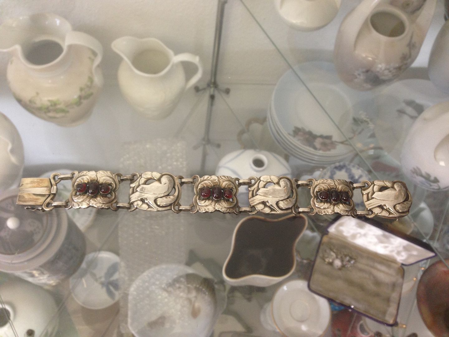 Georg Jensen Silver Bracelet with Birds and Granats Stones No 14. Measures 19cm and is in perfect condition. We have 2 similar bracelets with other stones. From the 1930's.