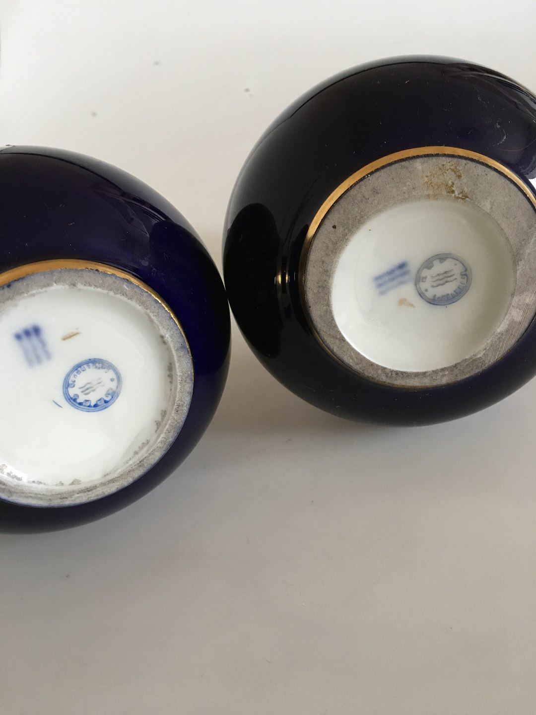 Par Sjældende Royal Copenhagen Art Nouveau Cobolt Blå Vaser med guld dekoration med sjældende blå eksport stempler. Nok til Rusland. Måler 20,5cm og er i perfekt stand.
