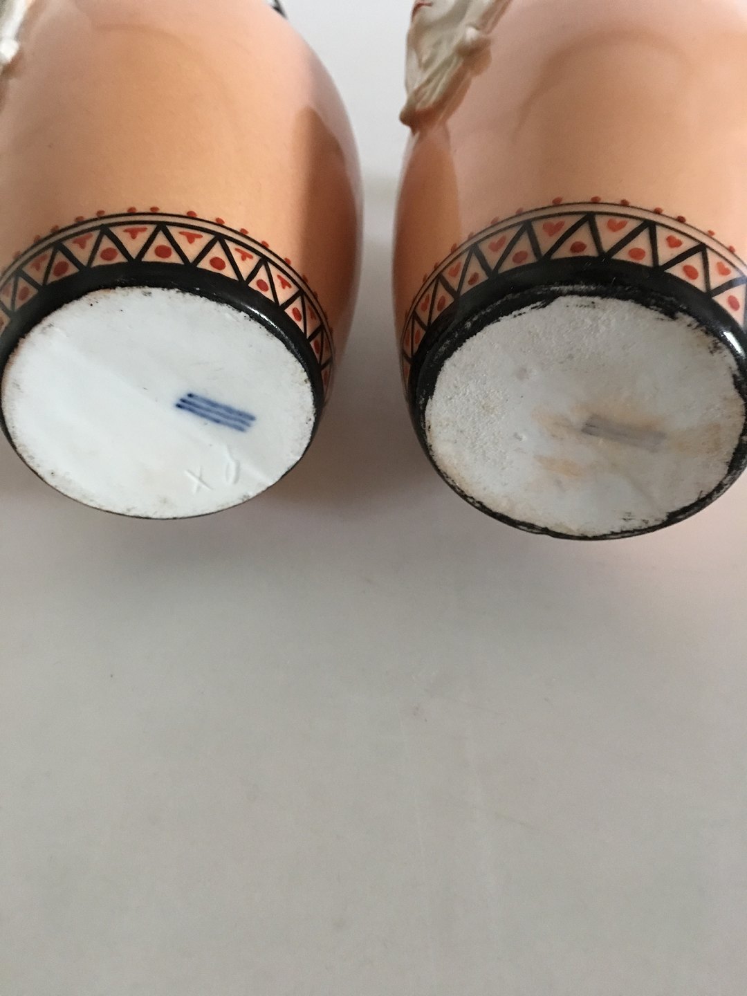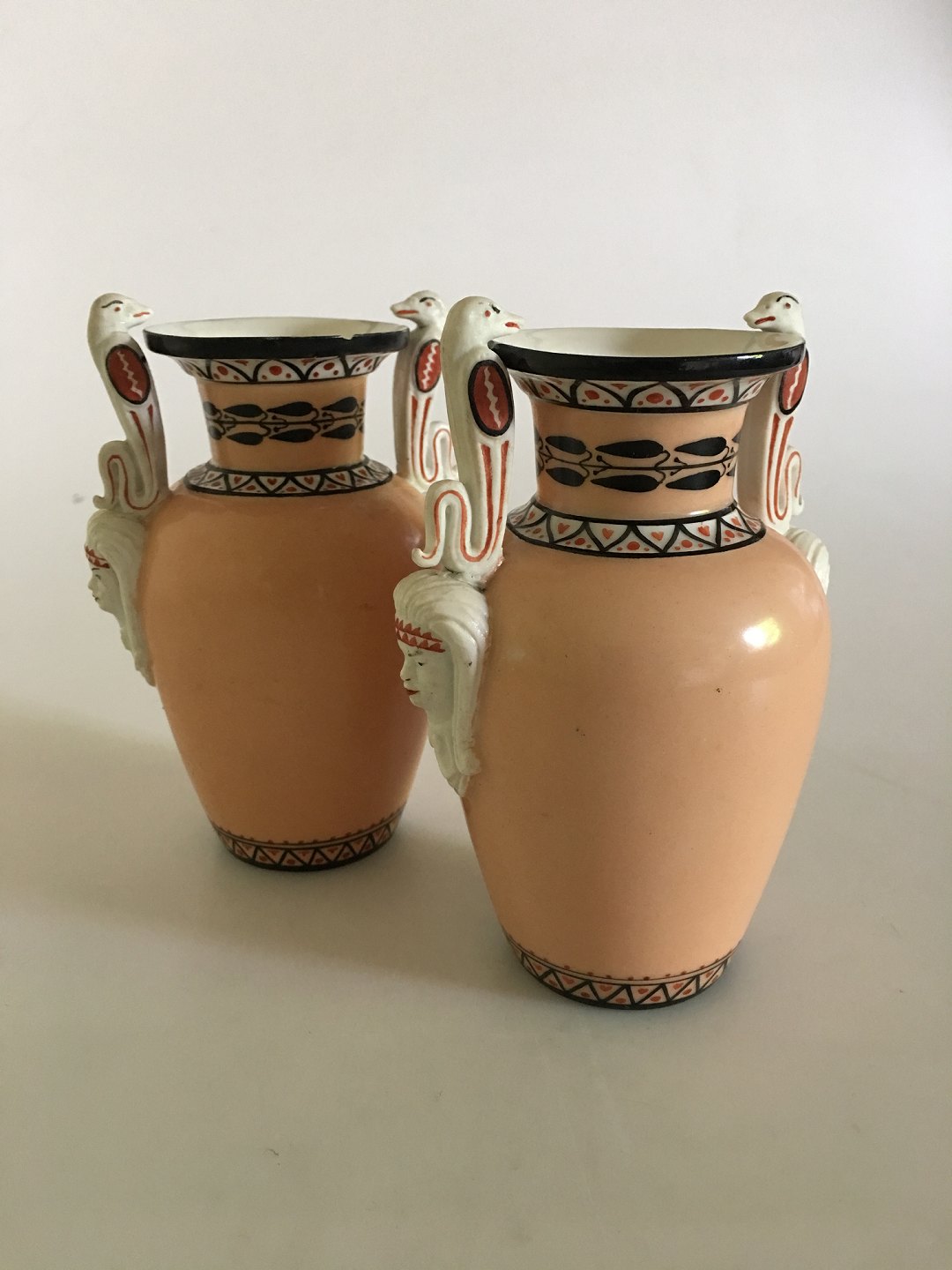 Pair of Royal Copenhagen Empire Vases with Egyptian motifs from 1850-1870. Measures 14cm high is in good condition, but one vase has chip.