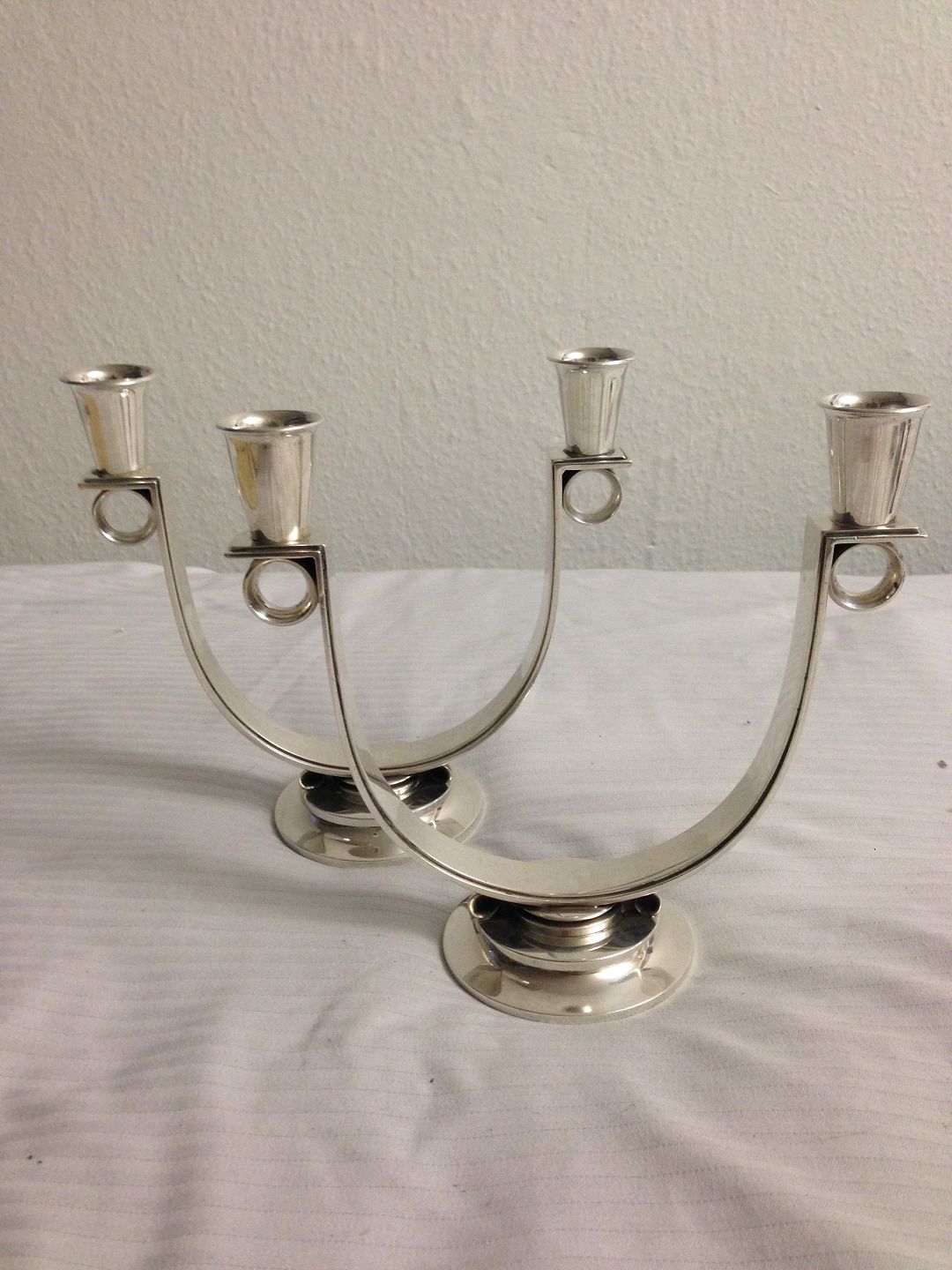 Par Georg Jensen Sterling Sølv lysestager No 623. Designet af Gunlach Pedersen og måler 16,5cm høje
