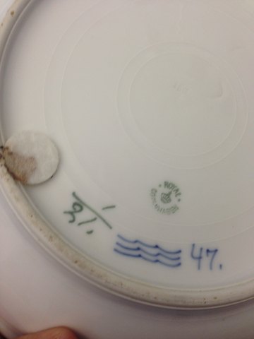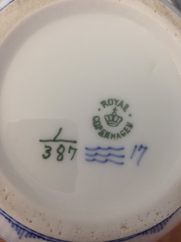 Royal Copenhagen Musselmalet Riflet Servante sæt No 21 skål og No 387 kande pre 1923. Skål måler 26cm dia og kande 17cm høj. Begge i god stand, men skål med lidt brugsspor.