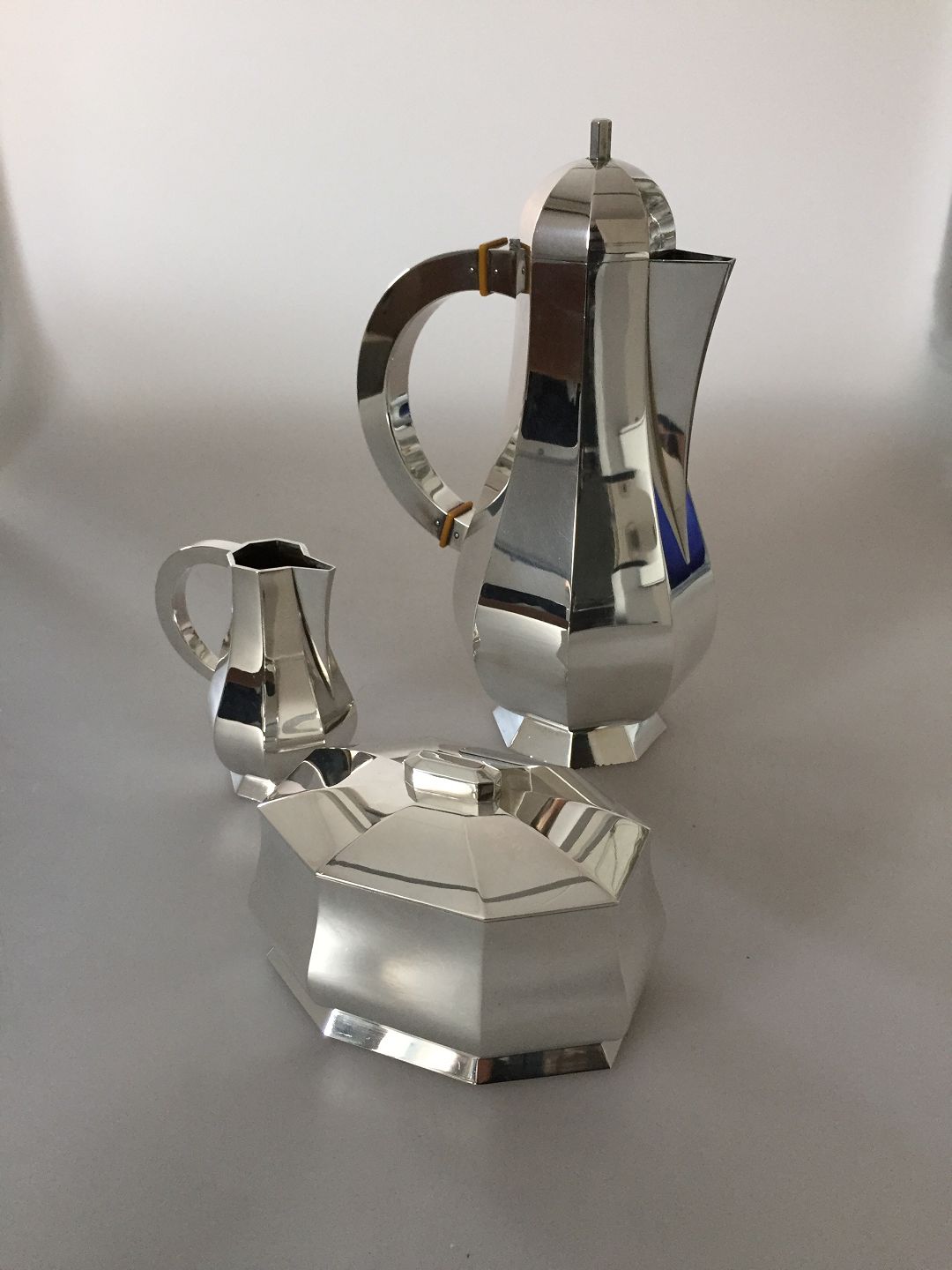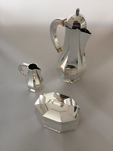Wiwen Nilsson Sterling Sølv Kaffe set med Kaffekande, Flødekande og sukkerskål. Kaffekande måler 26cm. Delene er fra 1940-1950'erne. Fremstår i perfekt stand.
