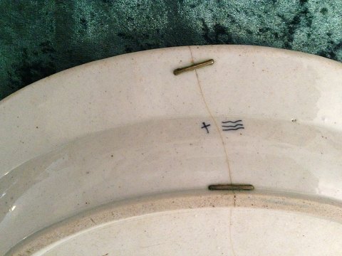 Royal Copenhagen Antik Musselmalet ovalt Fad fra før 1790. Måler 36,5 cm x 29,5 cm / 14 3/8 in x 11 39/64 in. Er klinket flere steder bag på.