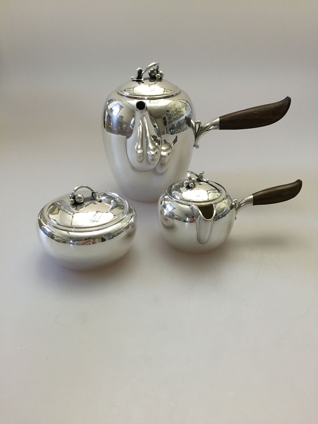 Georg Jensen Sterling Sølv Kaffekande, flødekande og sukkerskål af Harald Nielsen No 875. Kande måler 22,5cm x 16,5cm, fløde 15cm x 9cm og sukker 10cm x 7,5cm. I perfekt stand.