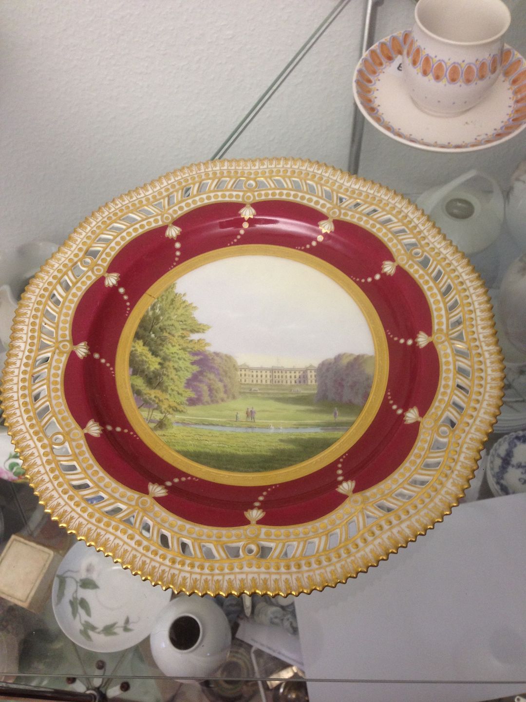 Royal Copenhagen Flora Danica Typografical Dinner Plate of Frederiksberg Castle, painted by Emil Ort and signed by him. Measures 25,5cm. From before 1900. Perfect condition.