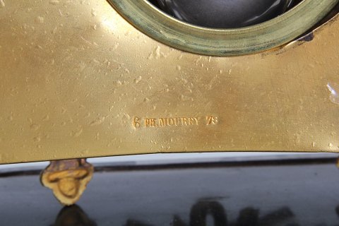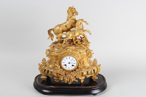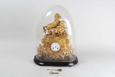 Antik Fransk Konsolur af Bronce. Figurer af Springende heste, våben og grene. Mærket med Ph. Mourey og kommer med stand og glas kuppel. Måler 43cm x 36cm.
