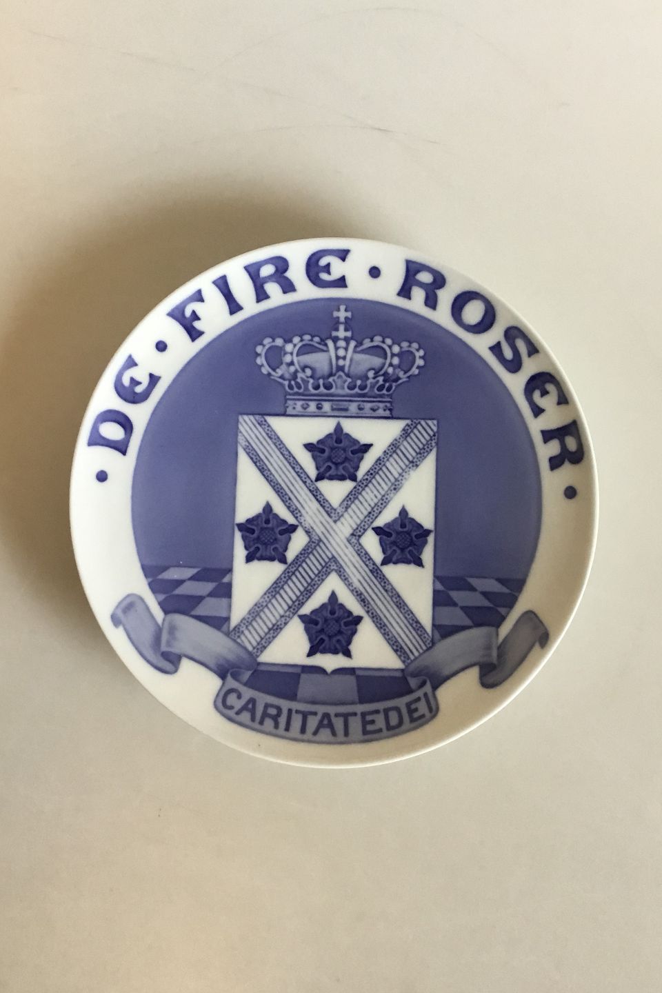 Royal Copenhagen Mindeplatte fra 1909 RC-CM100. Frimurerlogen "De Fire Roser". I Aarhus. Kronet skjold med andreaskors og fire roser. Indskrift: De Fire Roser - Caritate Dei ) (Ved Guds Kærlighed). Udført til logen Skt. Andreas, stiftet i 1908.