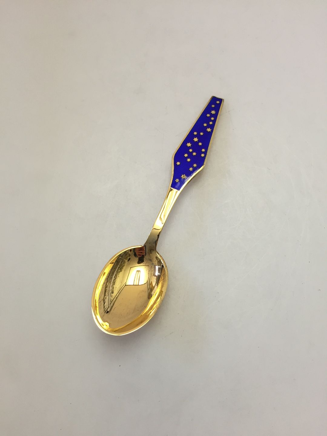 Sorenco Juleske 1970 af forgyldt sterling sølv med blå emalje. Måler 16,5 cm.
