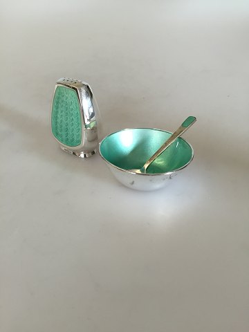 Anton Michelsen Salt & Pepper set in sterling silver with green enamel. The peppershakers height is 5 cm (1 31/32"). Diameter of the saltbowl measures 5 cm (1 31/32"). Combined weight is 48 g (1,70 oz). In good condition.