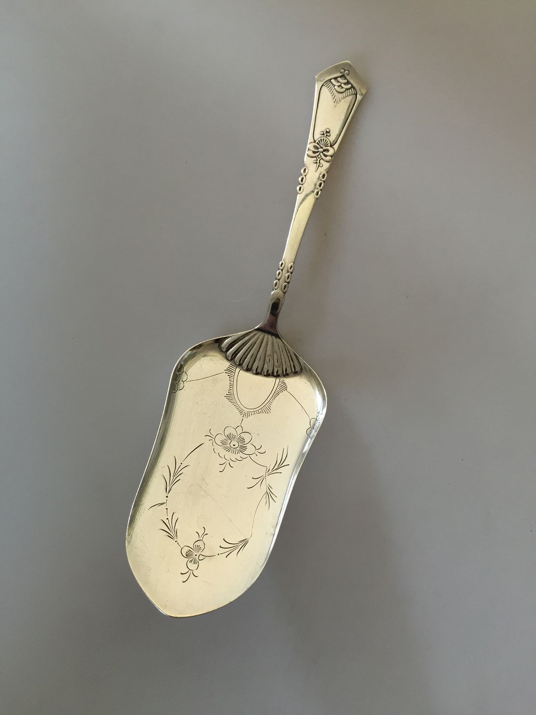 Stor Lagkage Servingsske i Sølv med flot mønstre fra 1913. Måler 25 cm. Monogram bag på. Mærket med 3 tårne, 13 og H.S.