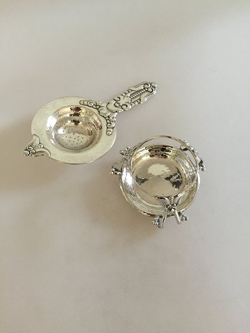 Beautifull Art Nouveau Teastrainer and teastrainholder in silver from DA Teastrainer. Measures 17 cm (6 11/16"). Height of holder is 4,5 cm (1 49/64") Combined weight is 124 g (4.35 oz).