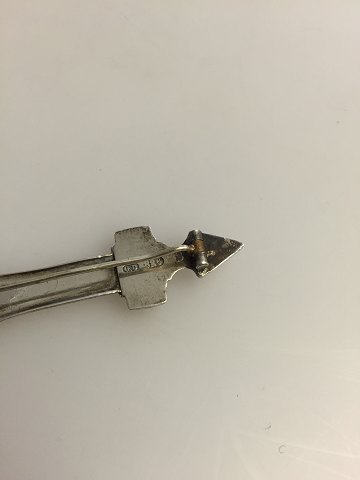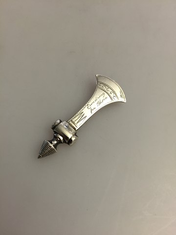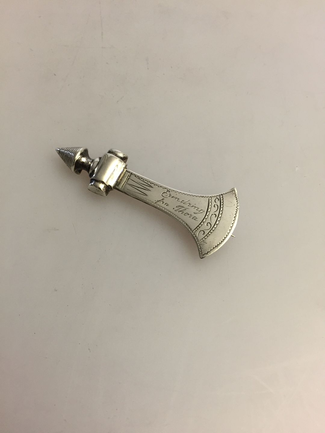 Sølv Broche formet som en økse. Med inskription der læser "Erindring fra Thora"