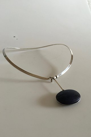 Georg Jensen Sterling Sølv Torun Halsring No 168 med Vedhæng No 133 af Lapis Lazuli. Designet af Vivianna Torun Bülow-Hübe. Halsringen måler 16,5 cm x 13,5 cm i bredden. Vedhæng måler 4,5 cm x 3 cm. Den samlede vægt er 51 g.
