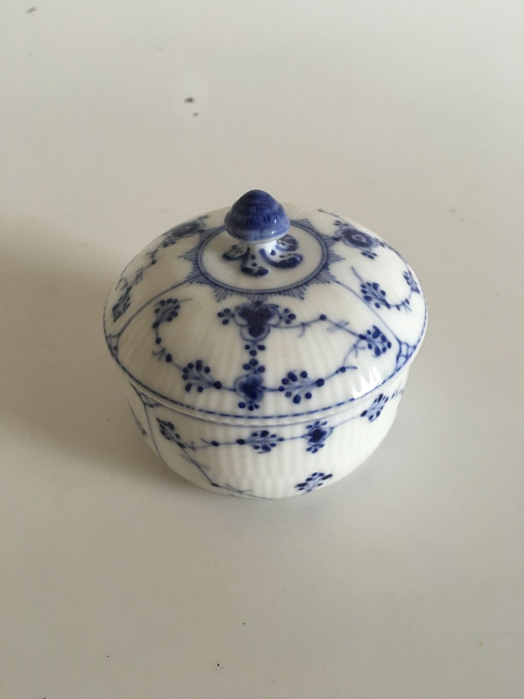 Royal Copenhagen Musselmalet Riflet Sukkerkrukke med Låg No 240. 9 x 9 cm
