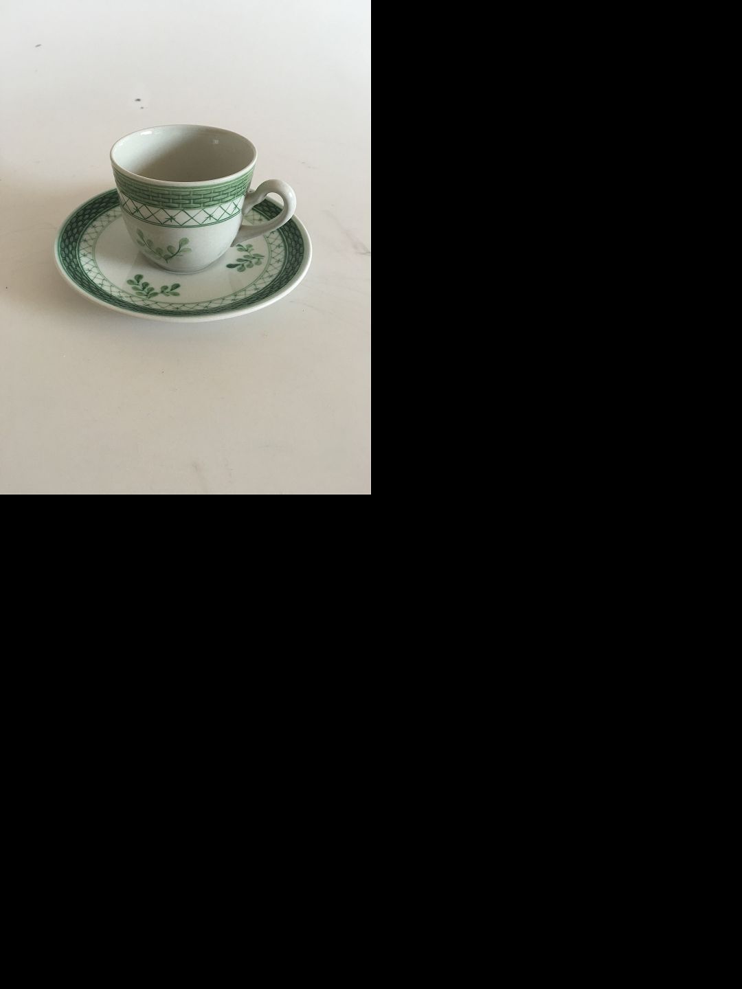 Royal Copenhagen Green Tranquebar Coffee Cup and Saucer No 992. Cup measures 7 x 5 cm (2 3/4" x 1 31732")
